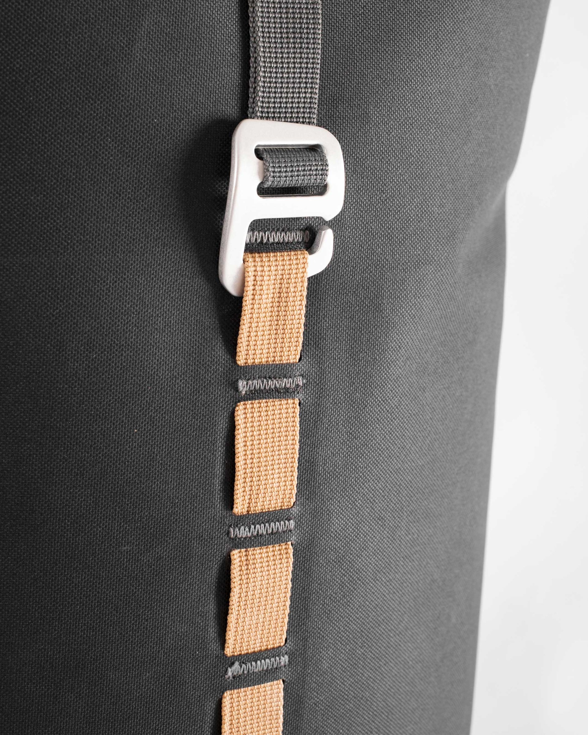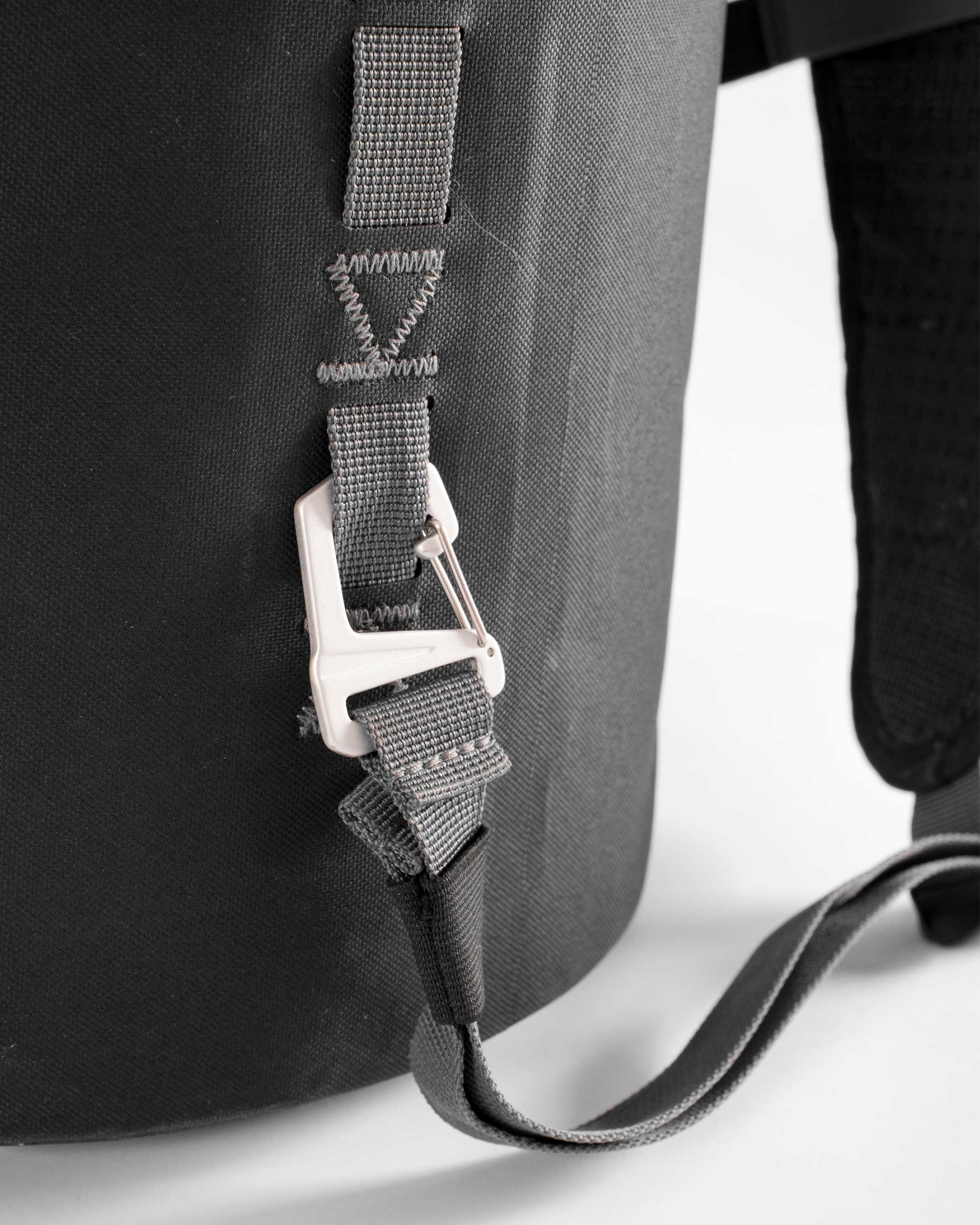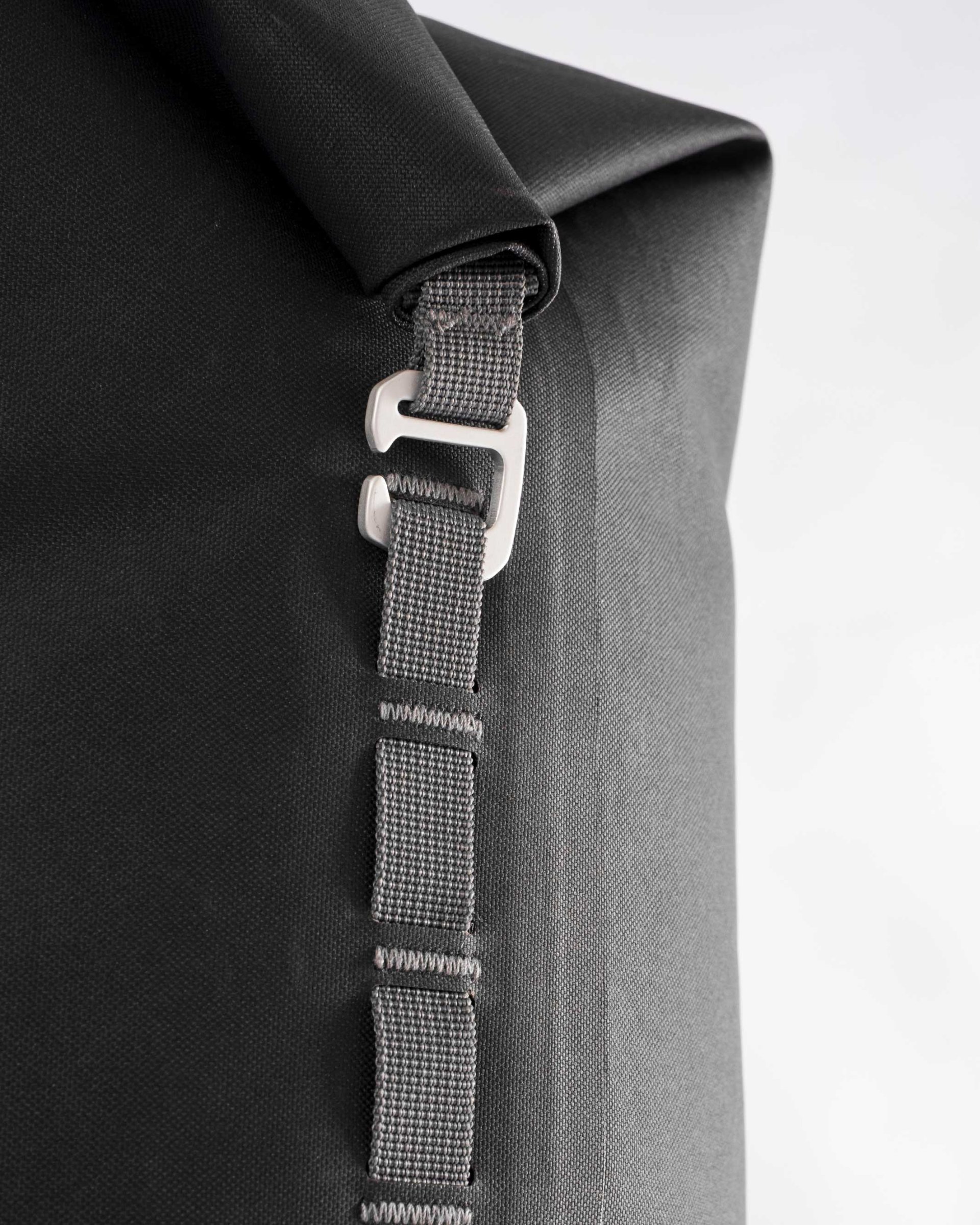 A roll-top záródás és a kettős G-hook rendszer kombinációja szoros és kompakt lezárást biztosít. A horgok a terhelés méretéhez igazodva különböző magasságokban rögzíthetők — nincsenek hosszú hevederek, nincsenek lobogó szabad végek.
