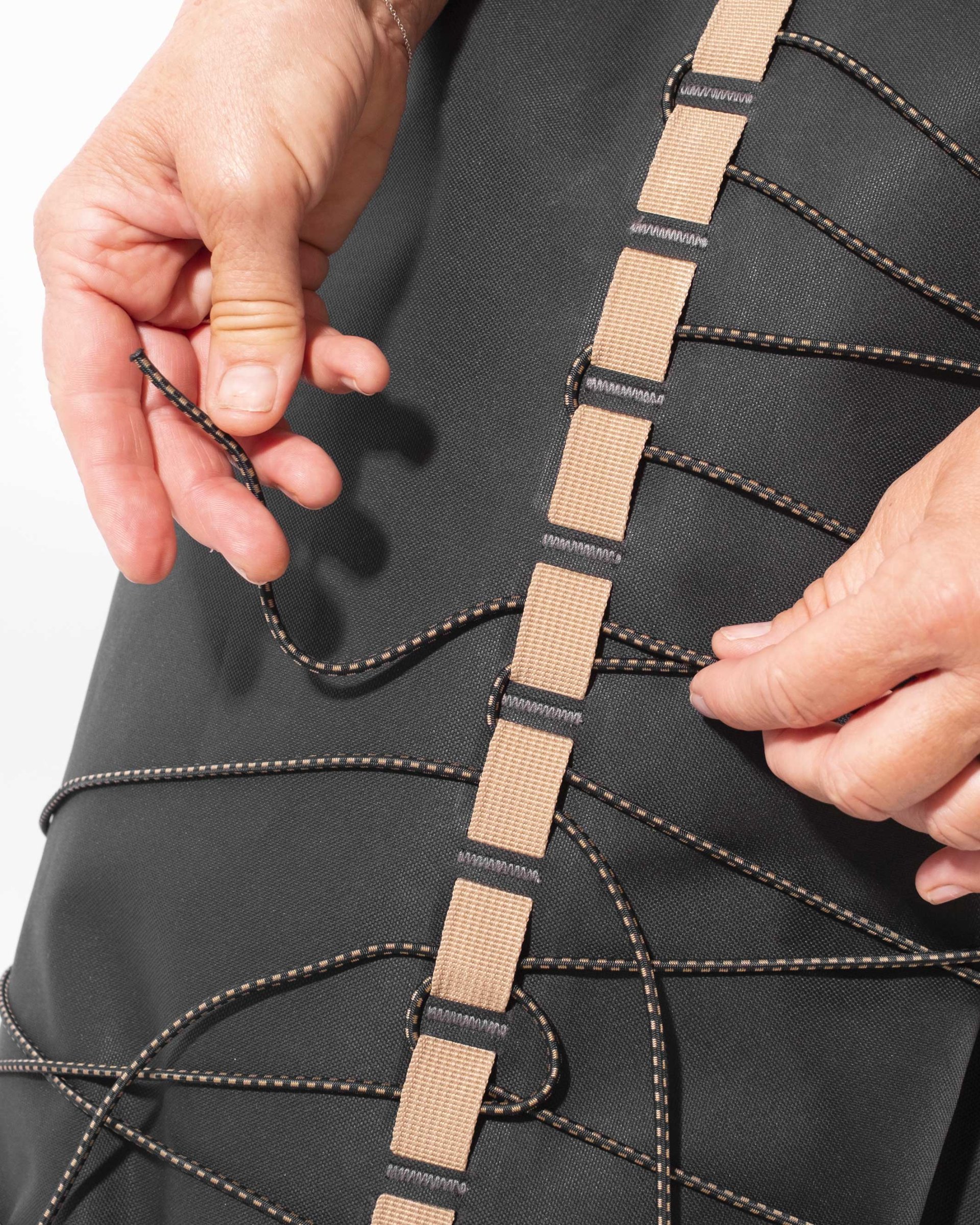A három lézervágott rögzítési zóna a rugalmas gumizsinórral lehetővé teszi, hogy az alábbiakat kívül rögzítsd: